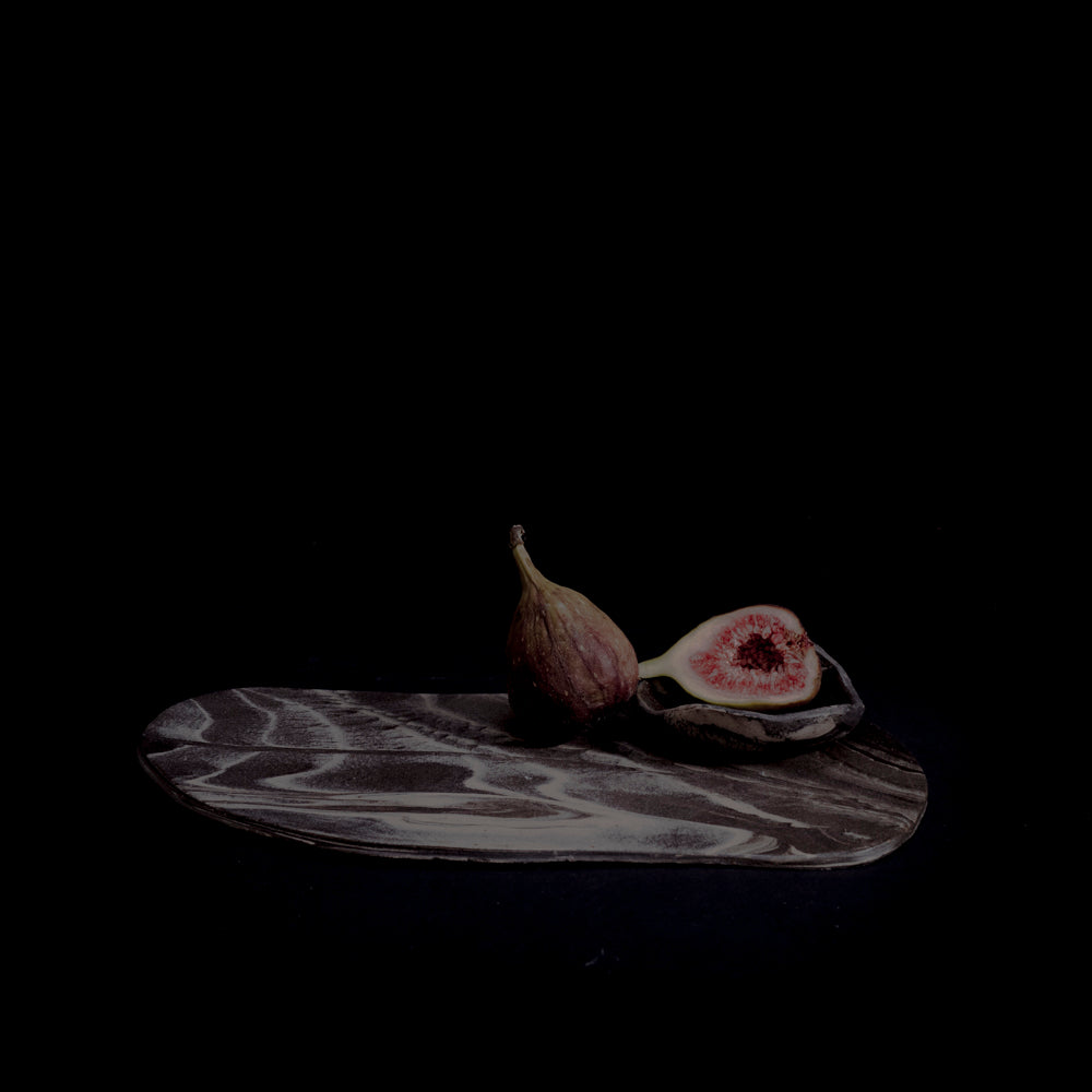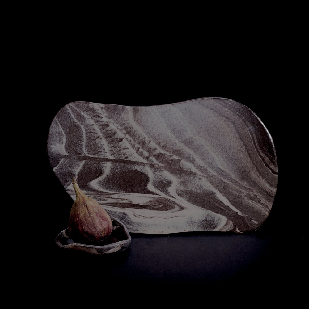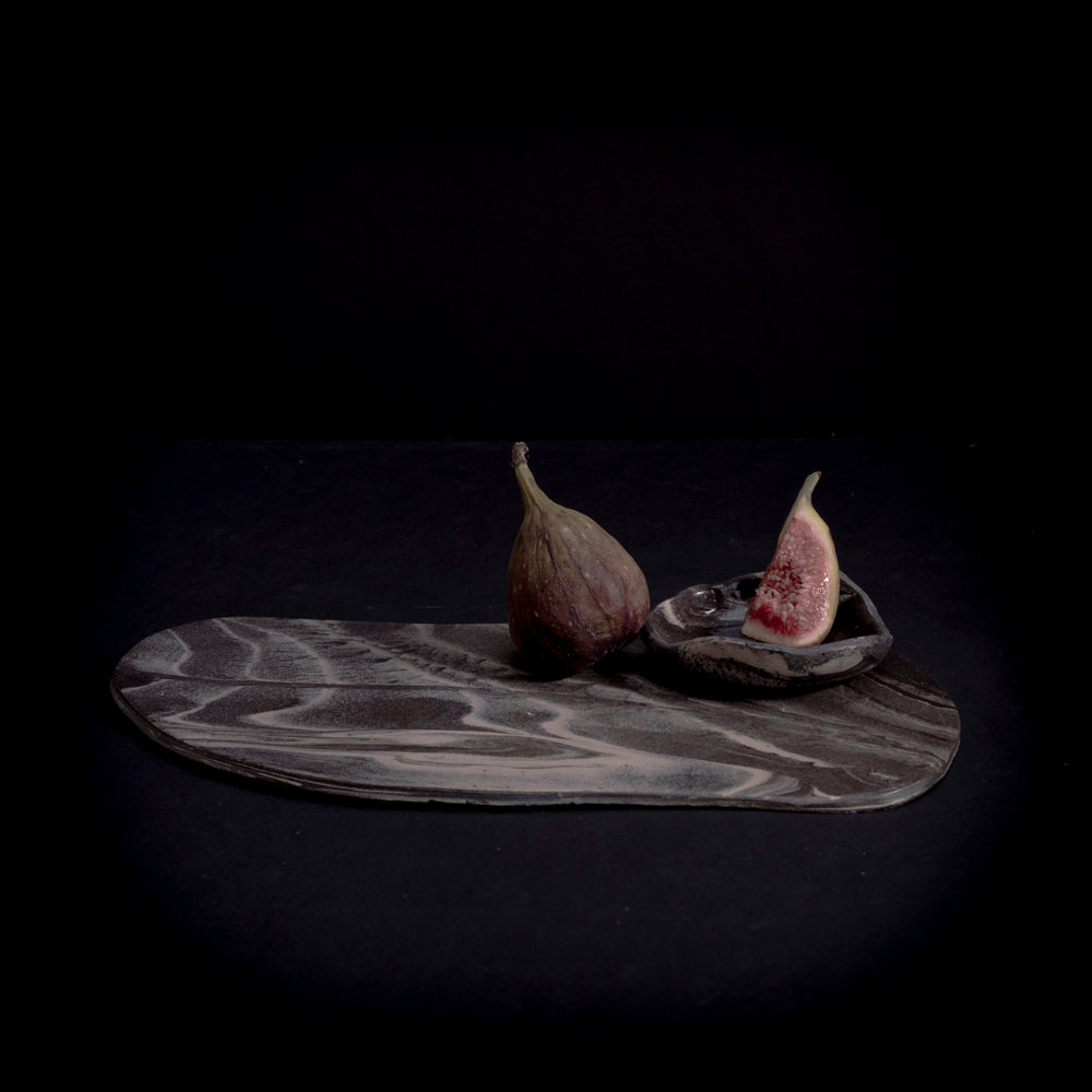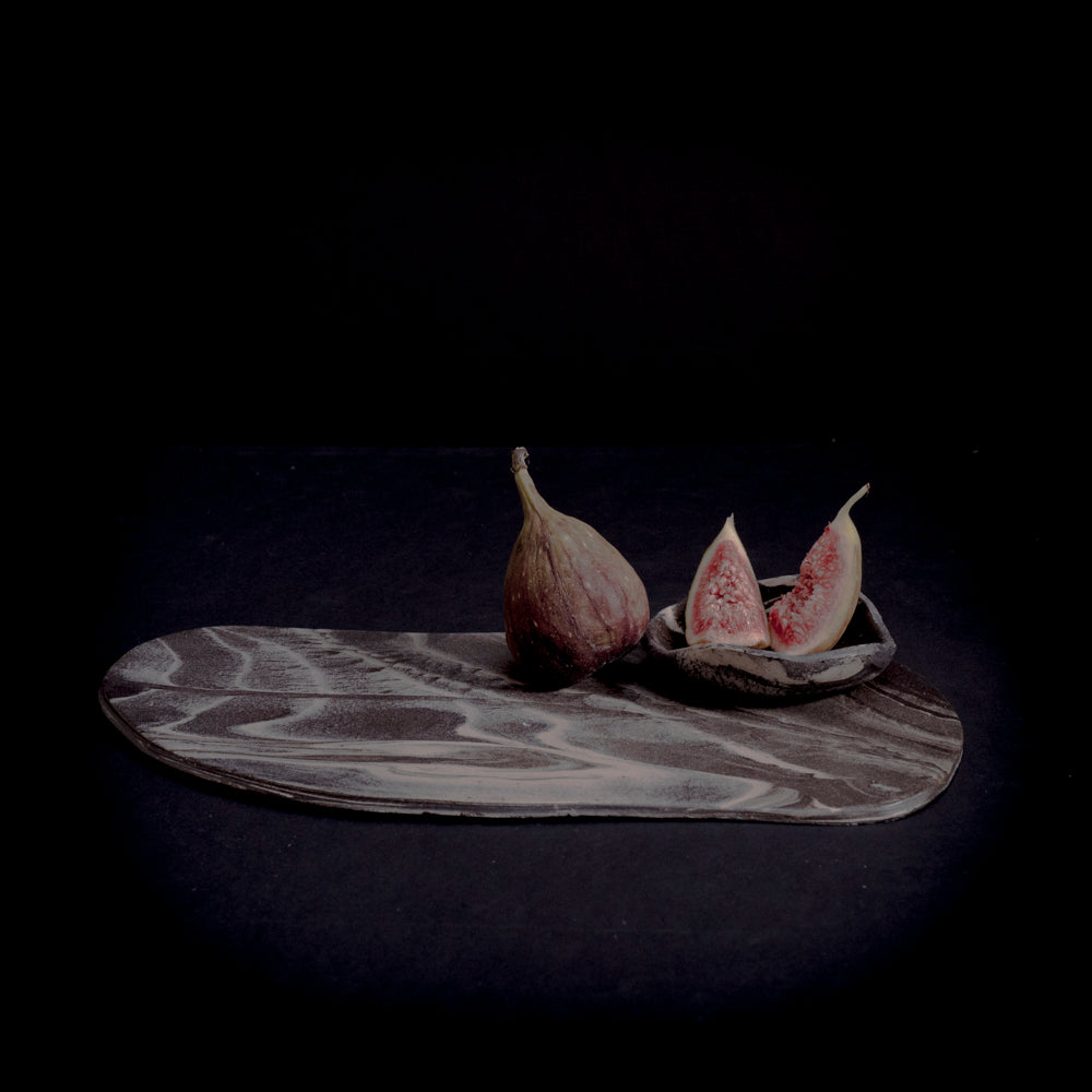 Serving and cutting plate made of black and white marbled clay. Glazed with a transparent glaze and fired at 1220˚C.