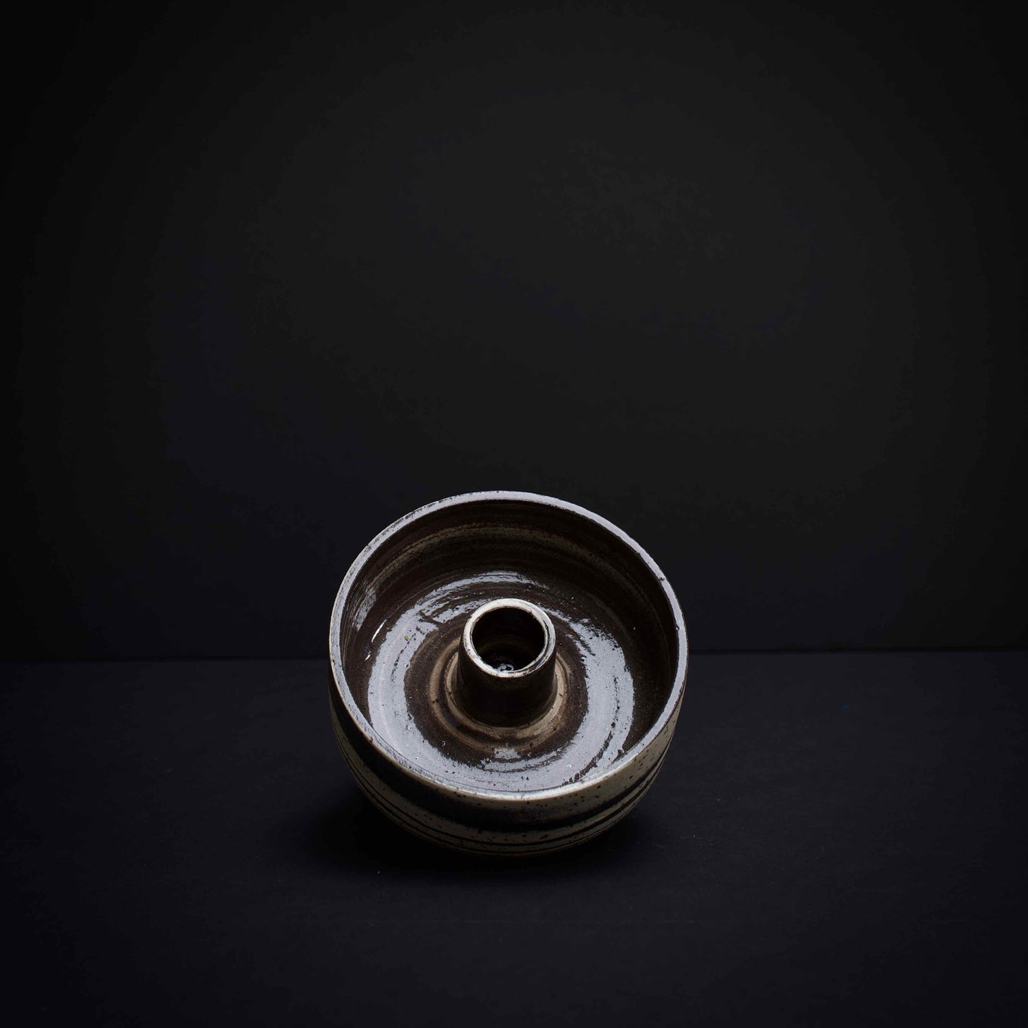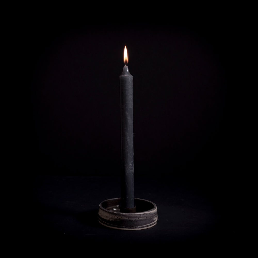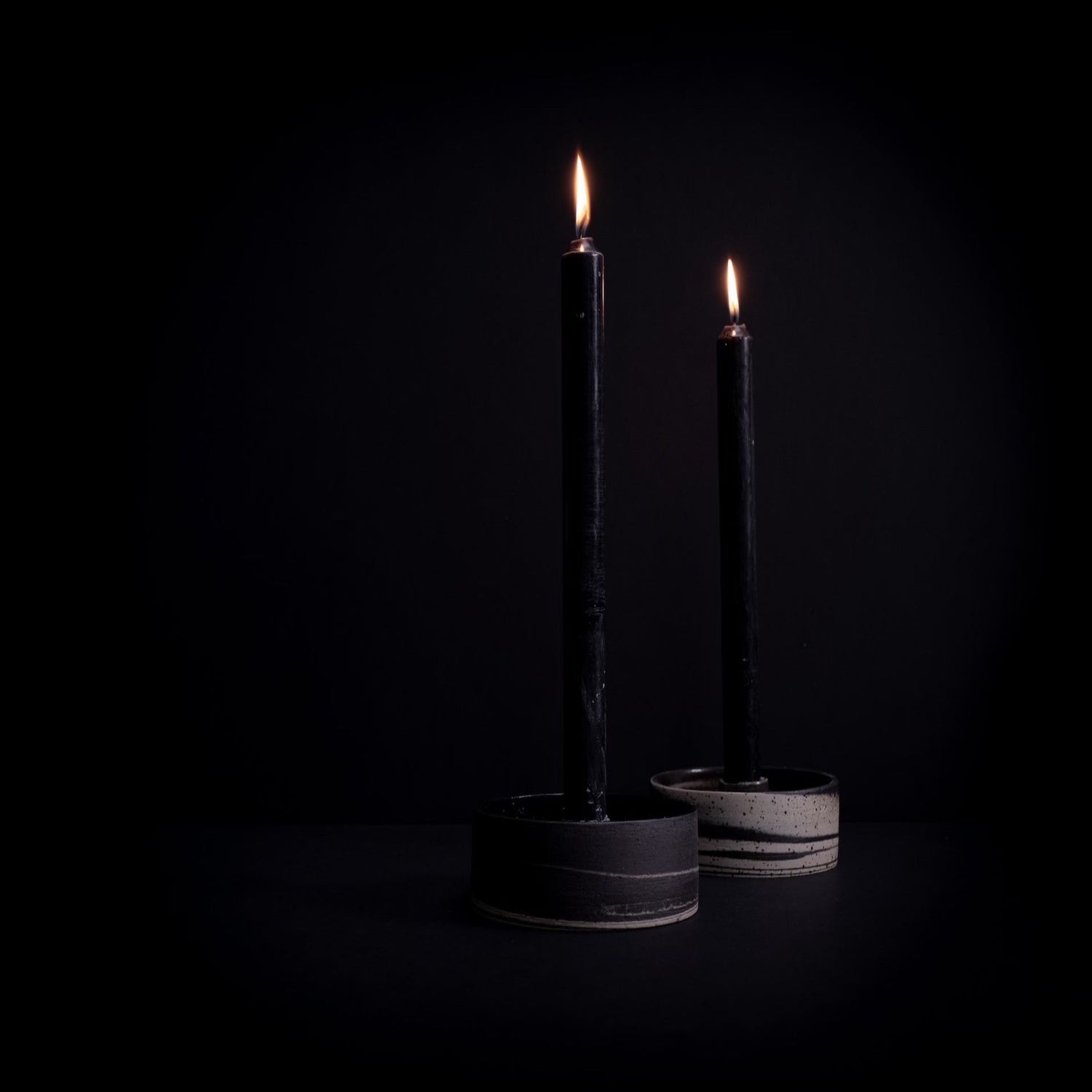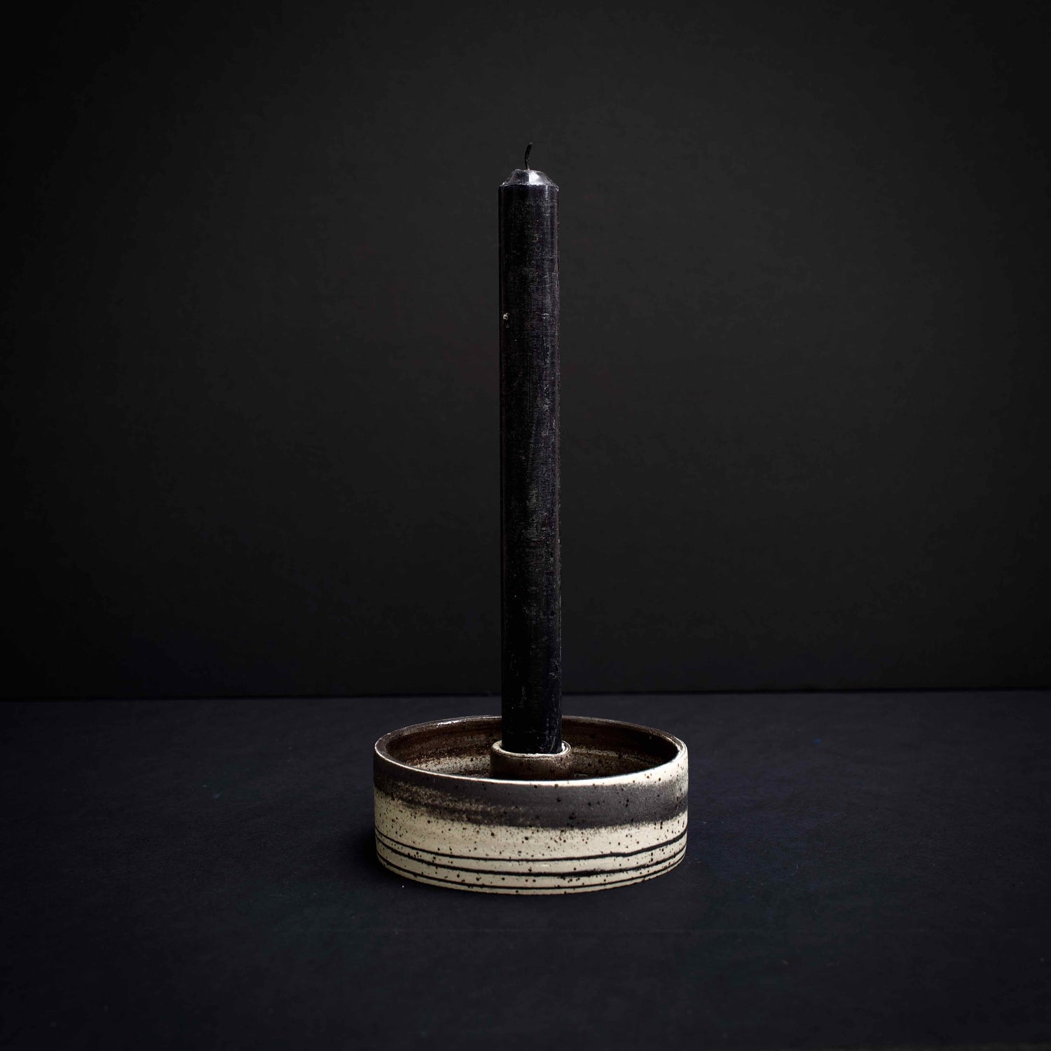 Candle holder in a marble mix of black and speckled clay, glazed with a transparent or black glaze inside and fired at 1220˚C.