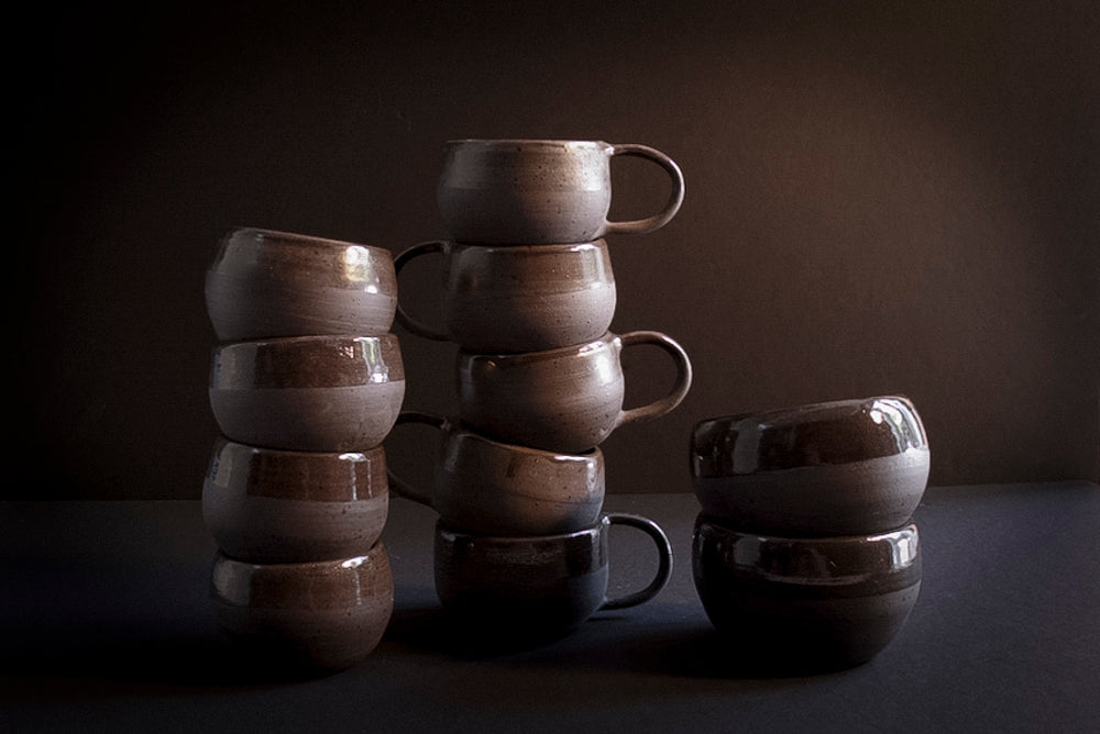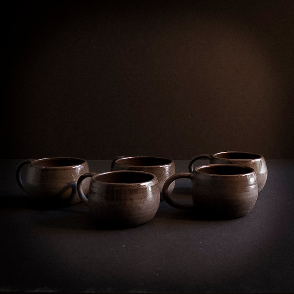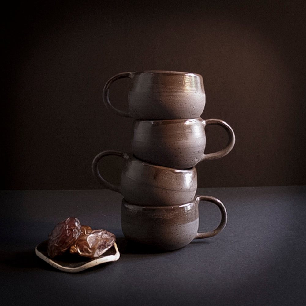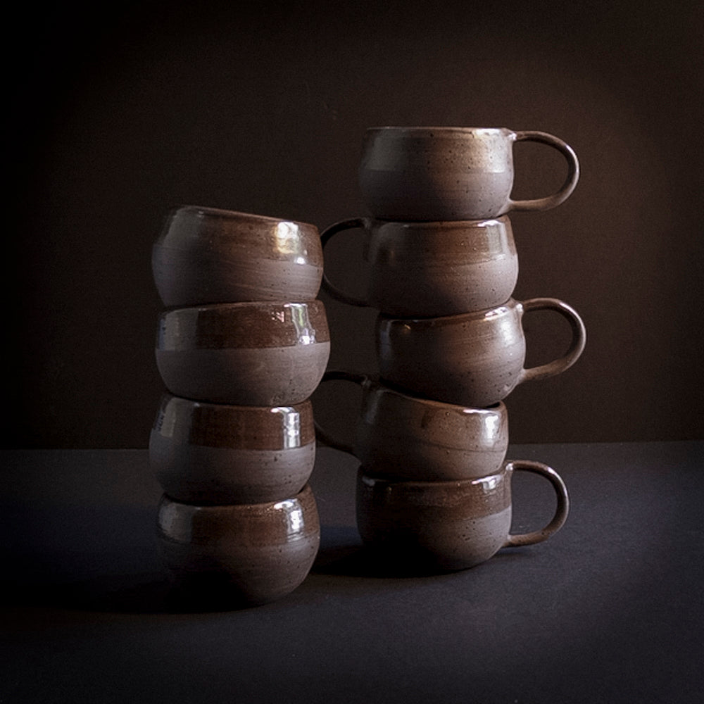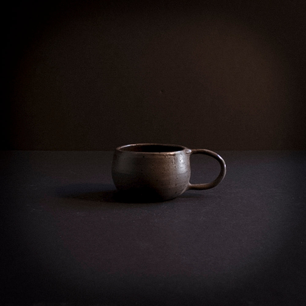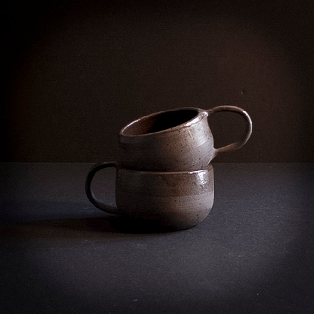 Black speckled tea / coffee bowls with ear. Glazed with a transparant glaze and fired at 1220˚C.