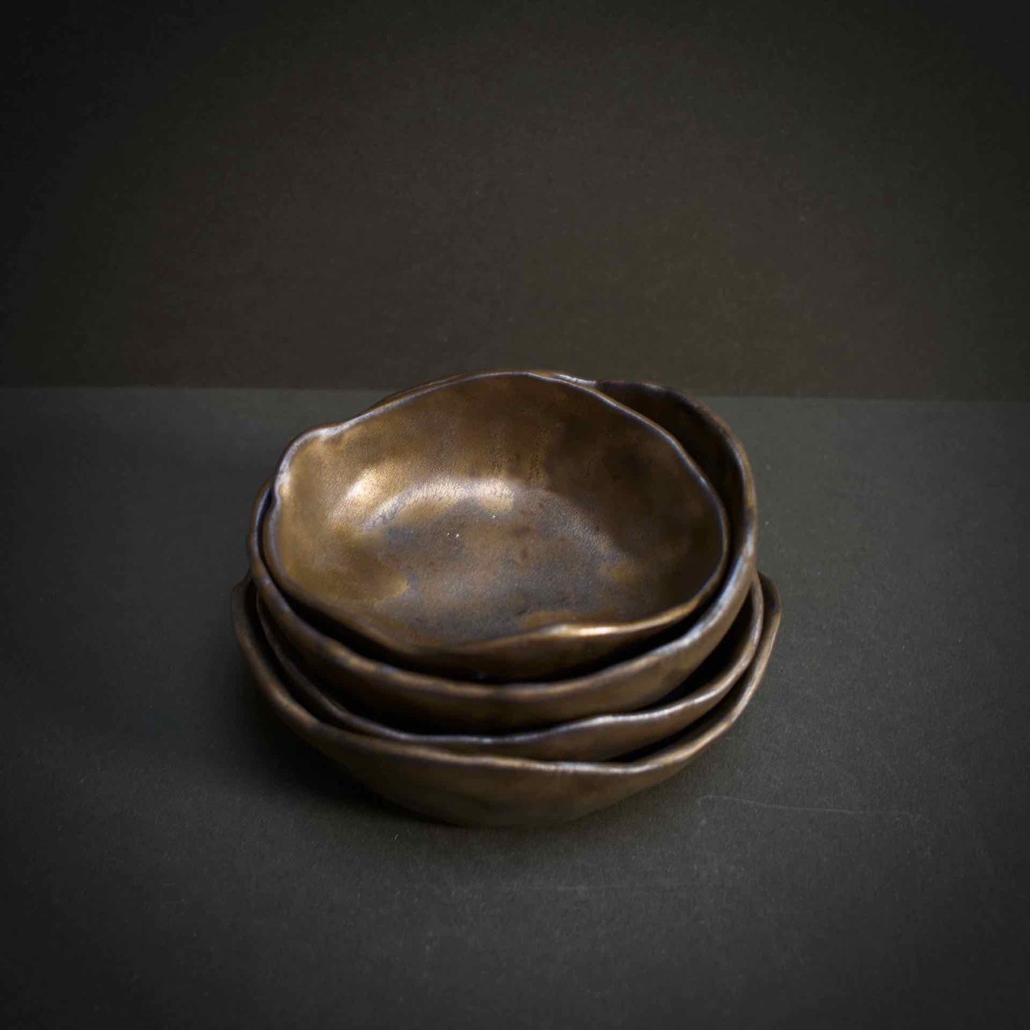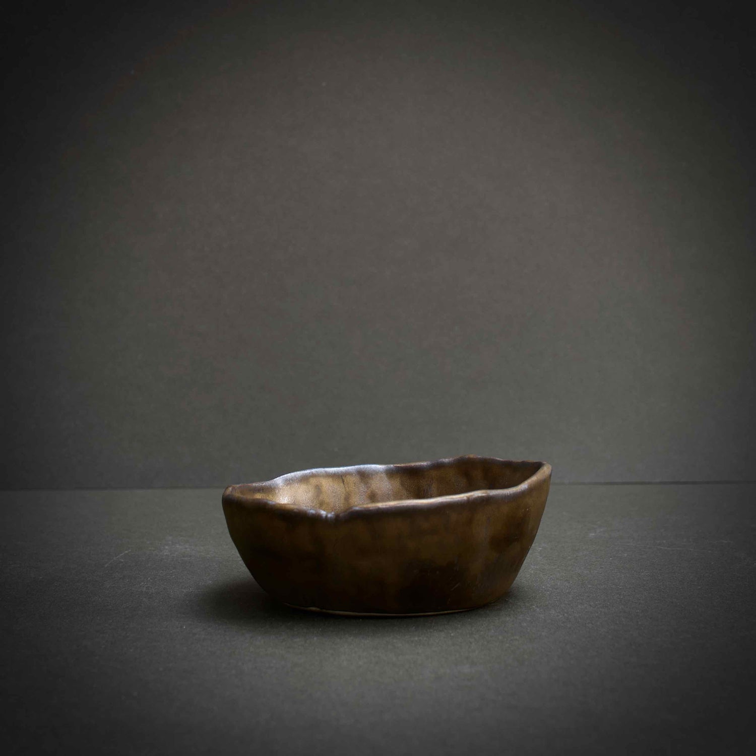 Organic shaped bowl, perfect for serving snacks like olives, tapenade, nuts or chips, glazed with a bronze effect glaze and fired at 1220˚C.