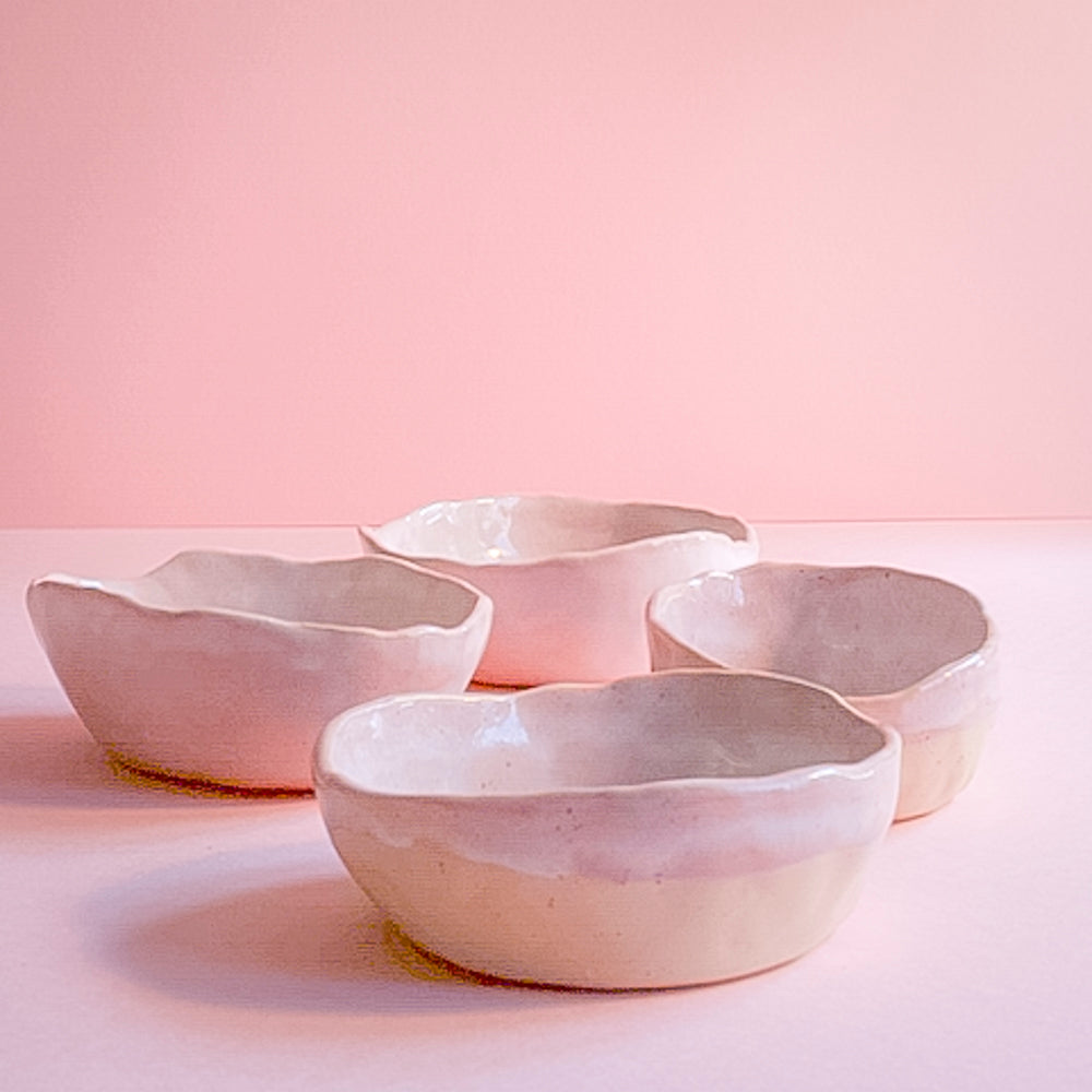 Organic shaped bowl, perfect for serving snacks like olives, tapenade, nuts or chips, glazed with a pink glaze and fired at 1140˚C.