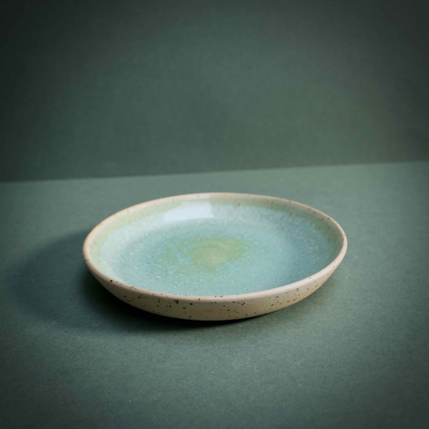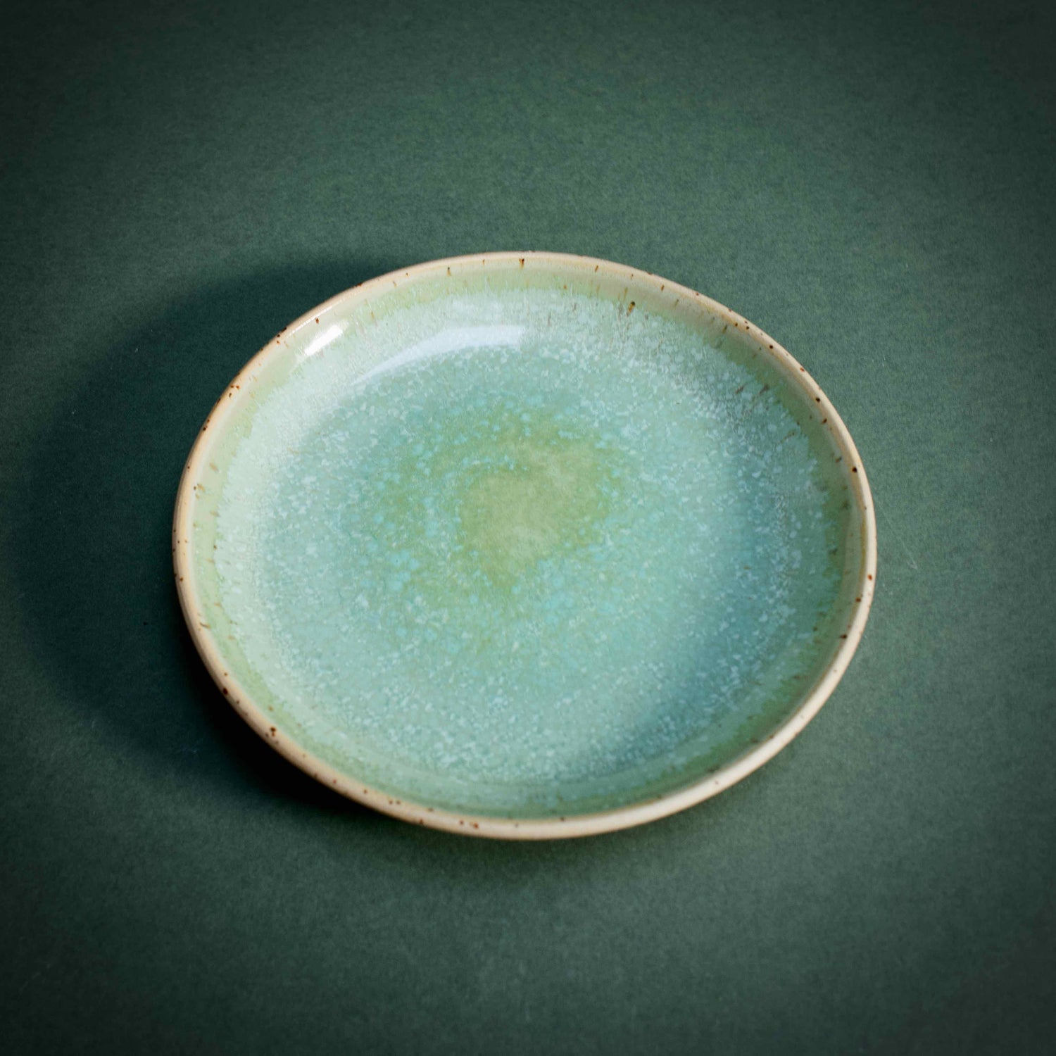 Little plate of speckled clay, glazed with a green cristaline glaze and fired at 1220˚C.