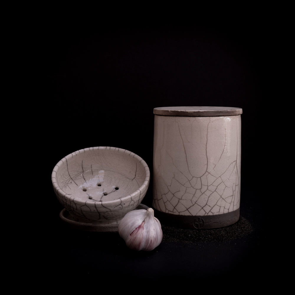 Storage jar of Raku clay, fired with a special Japanese technic (Raku), perfect to store products which do not have to stay fresh and crispy, like coffee-cups, teabags, sugar, rice.
