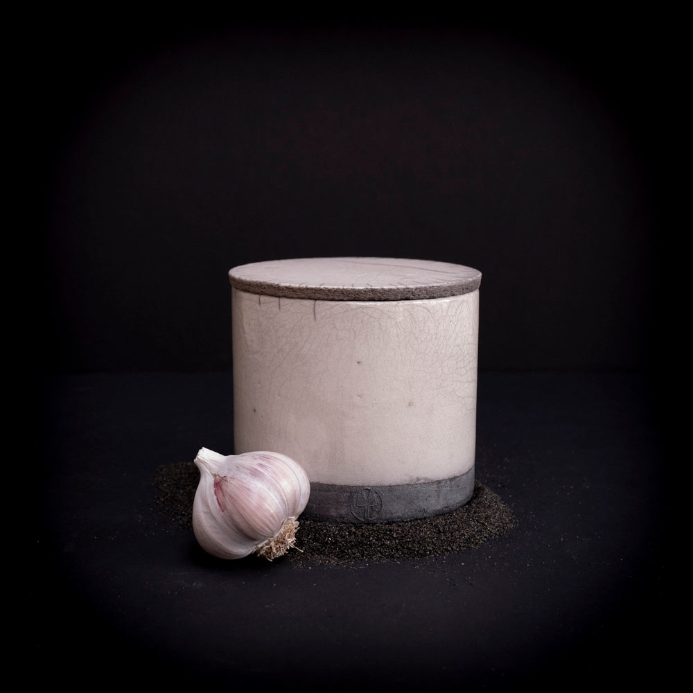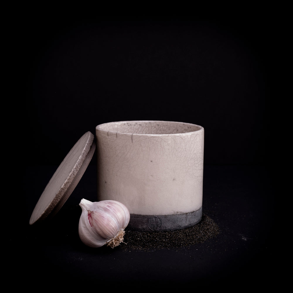 Storage jar of Raku clay, fired with a special Japanese technic (Raku), perfect to store products which do not have to stay fresh, like coffee-cups, teabags, sugar, rice.