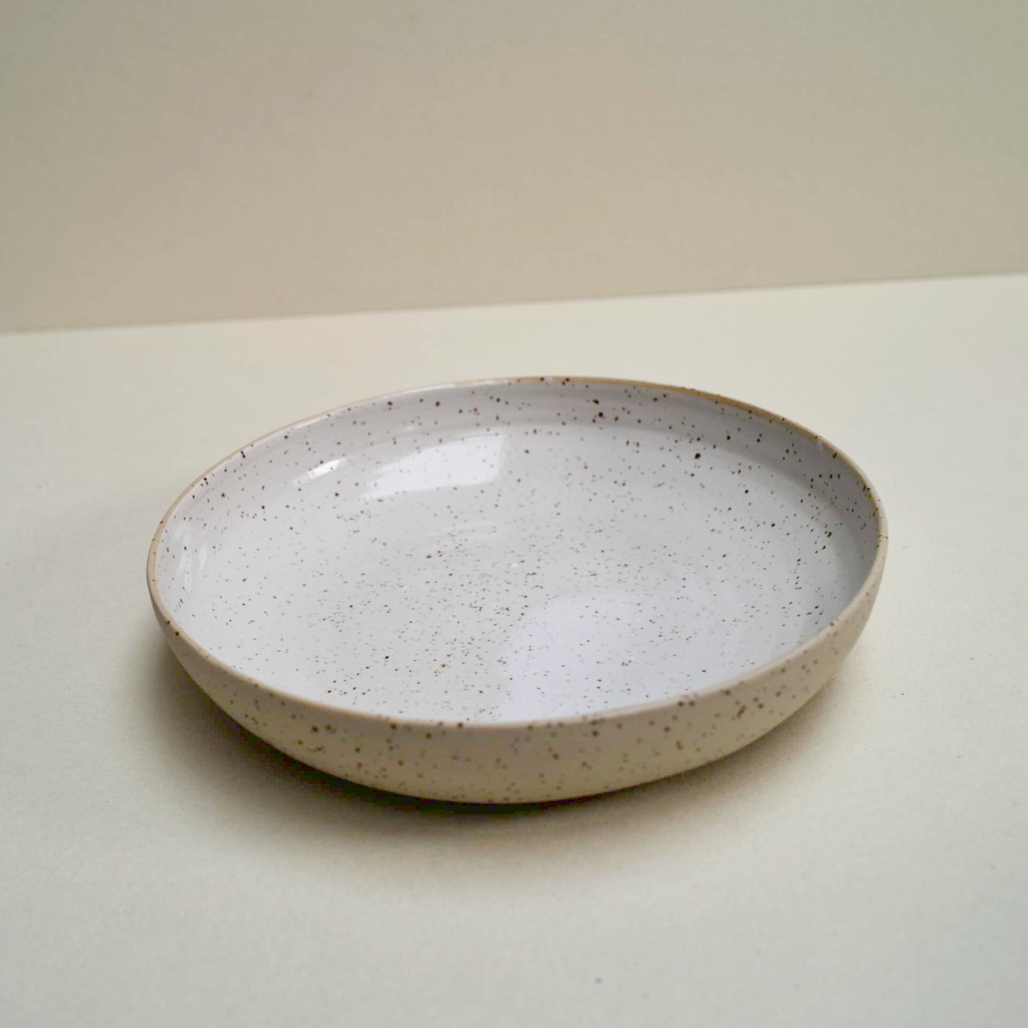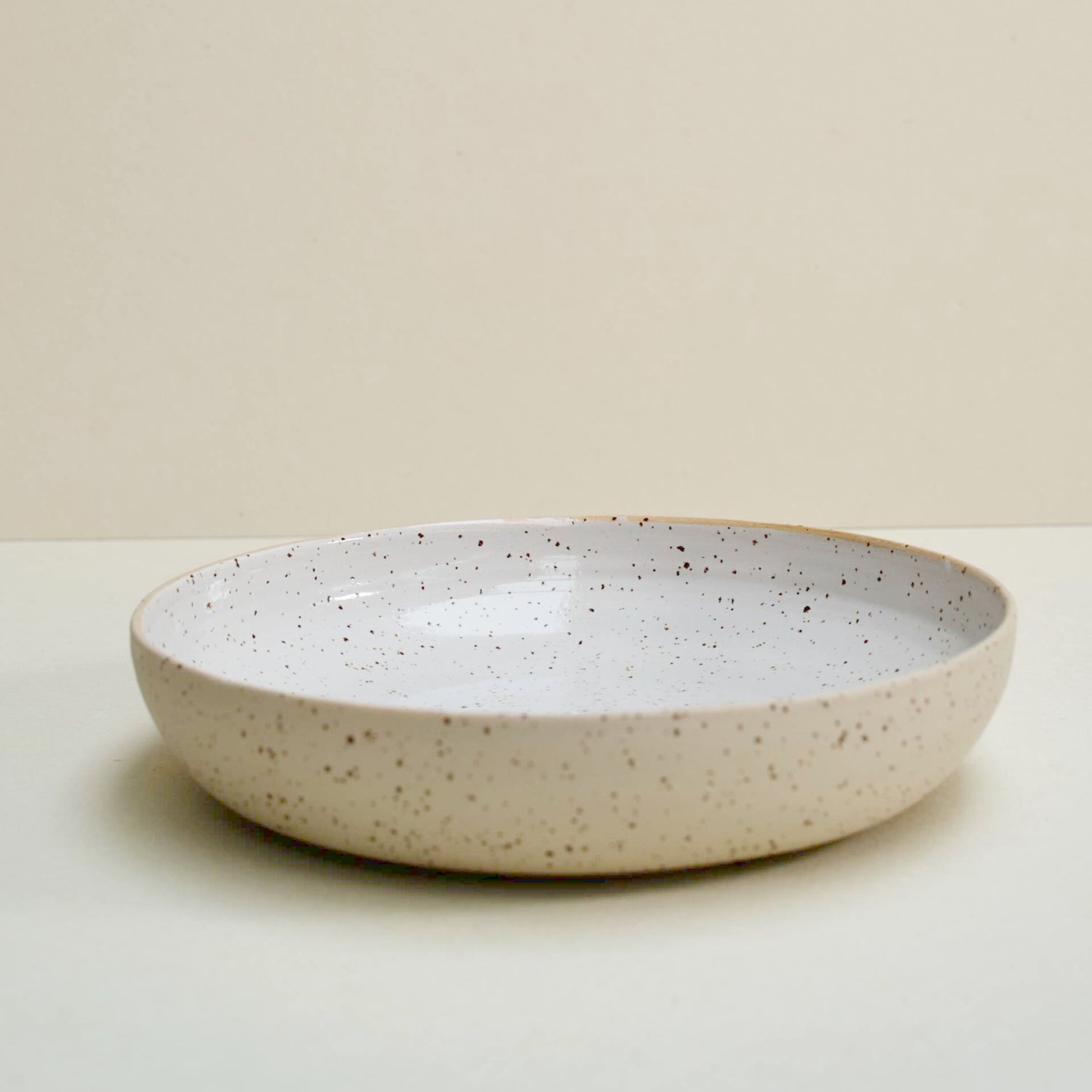 Speckled bowl ideal for a salade or some fruits. Glazed at the inside with a transparent/white glaze and fired at 1220˚C.