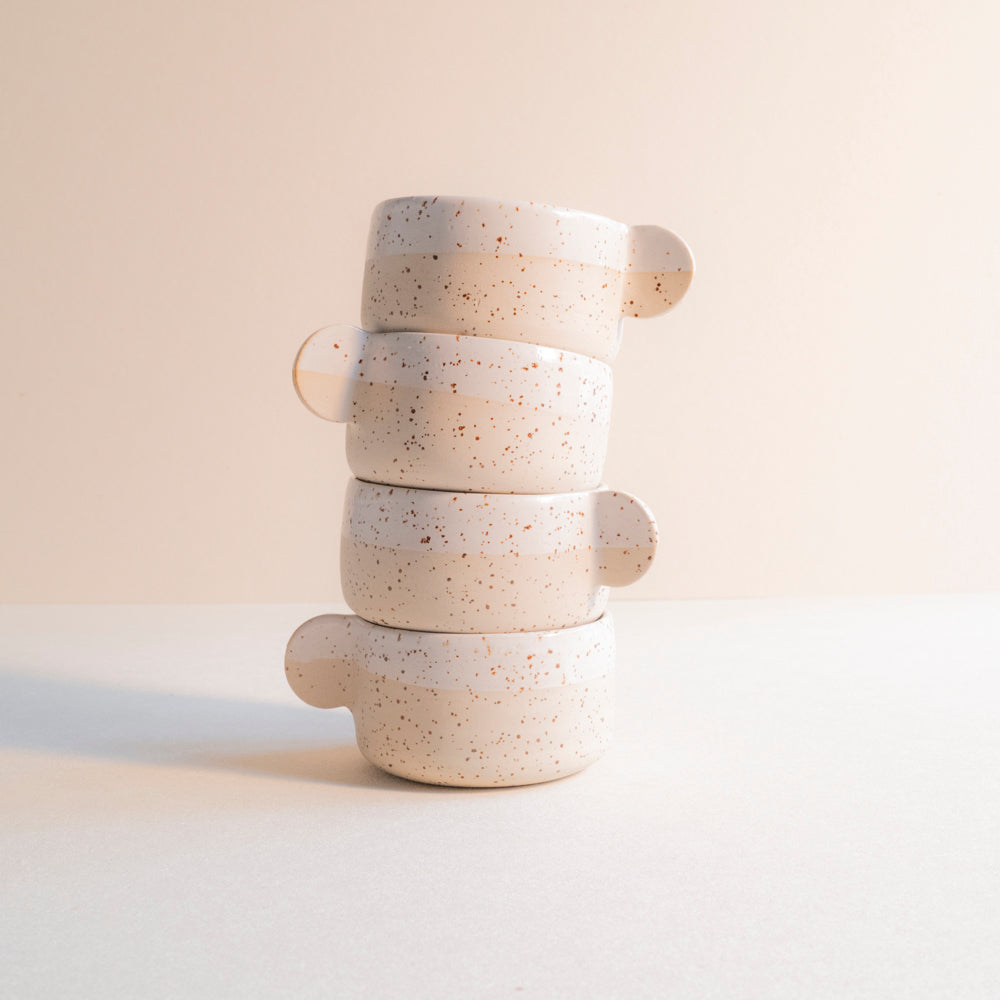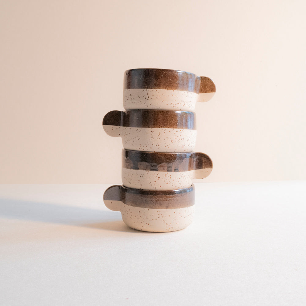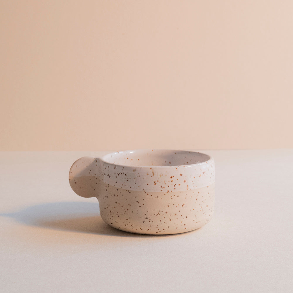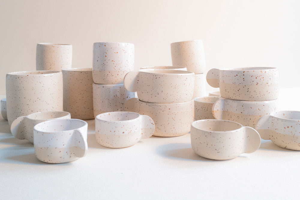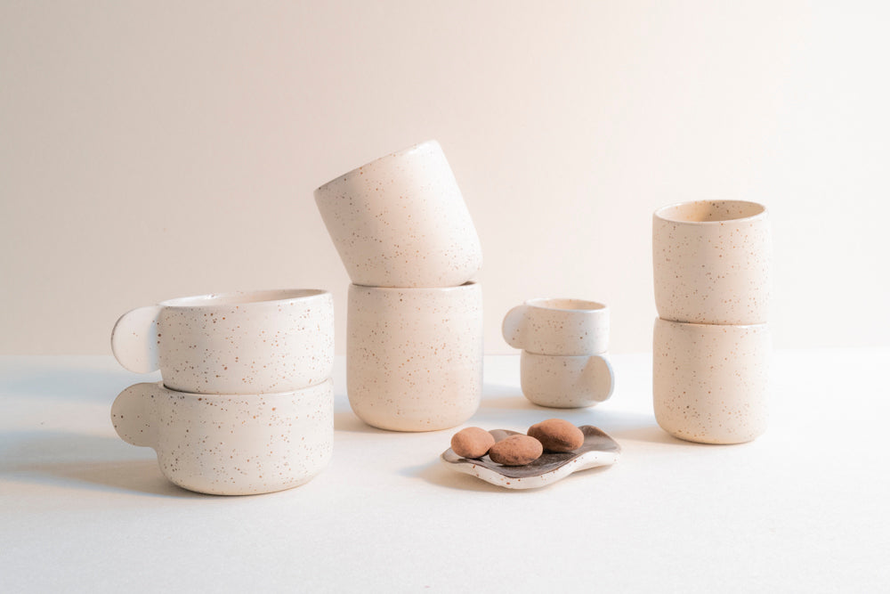 Speckled cappuccino cup. Glazed with a transparant, white or brown glaze and fired at 1220˚C.