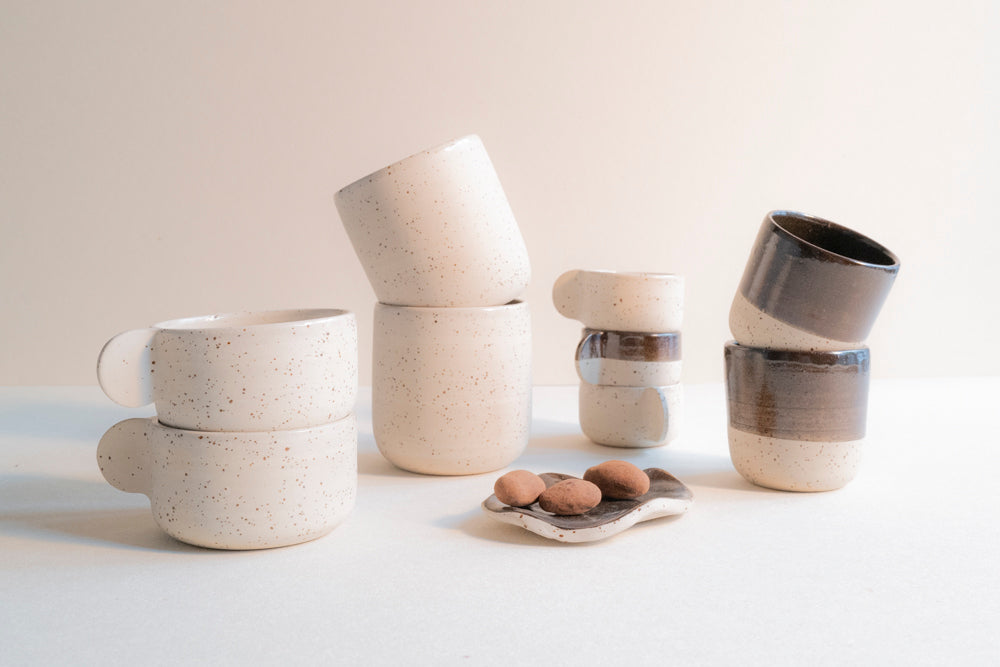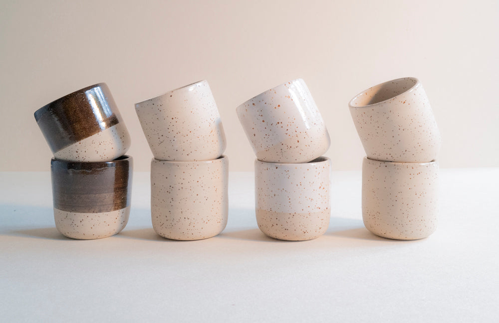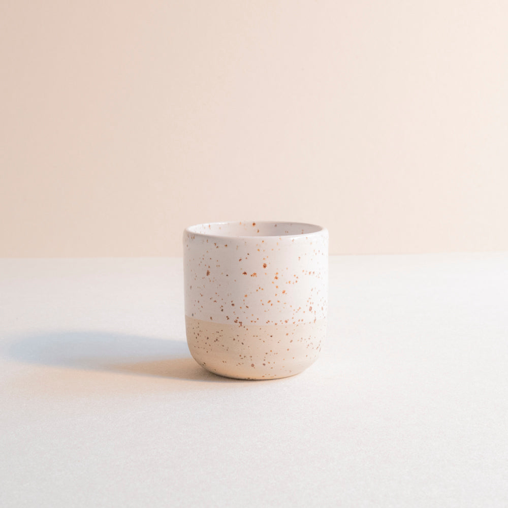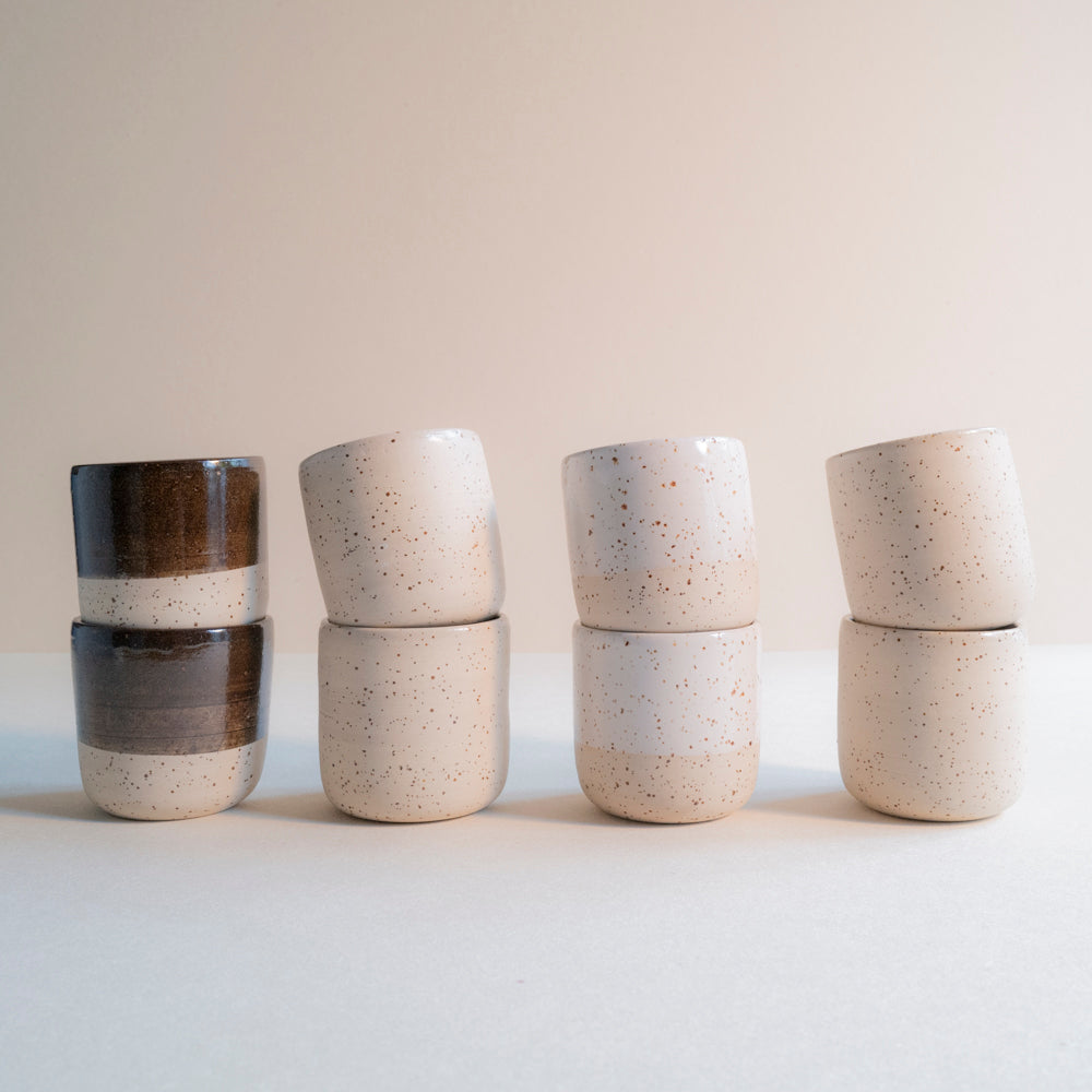 Speckled coffee cup. Glazed with a transparant, white or brown glaze and fired at 1220˚C.