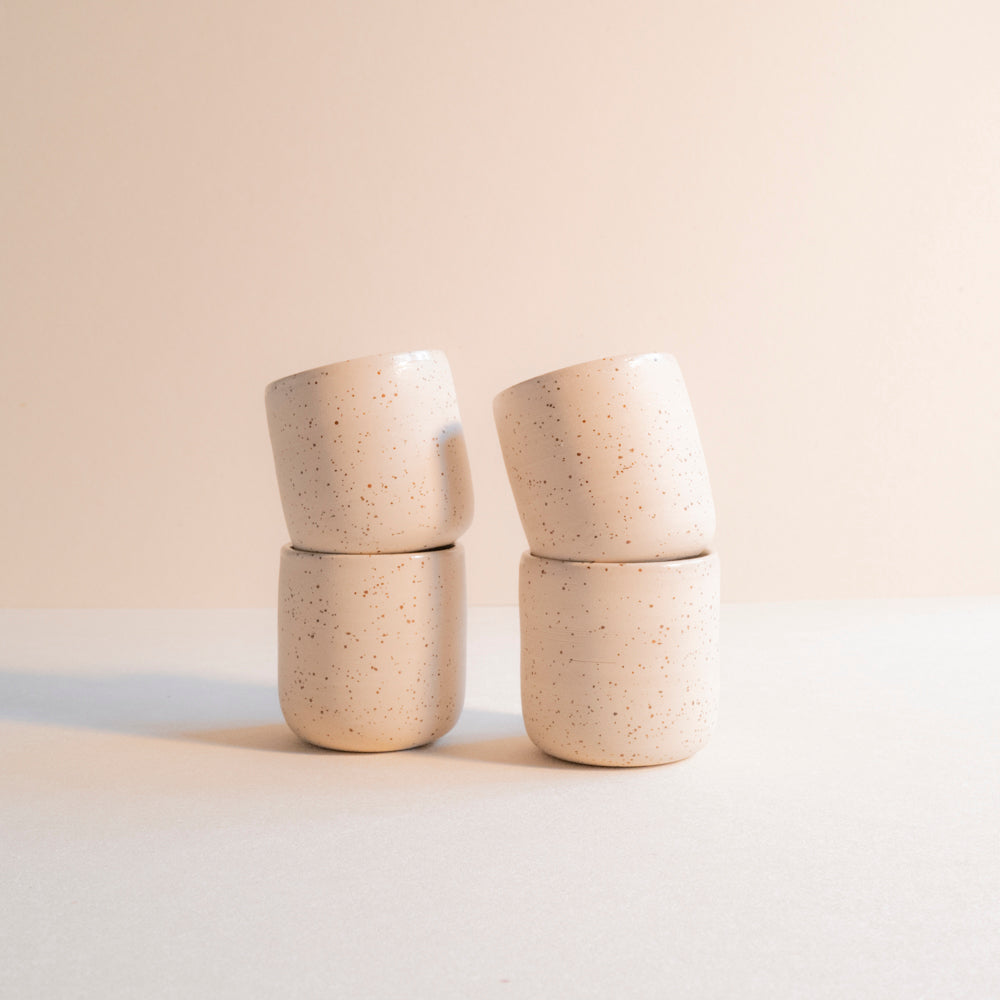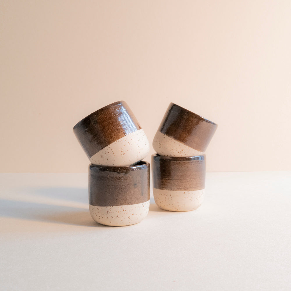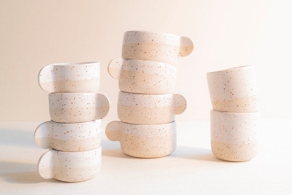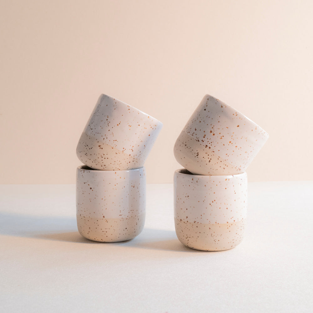 Speckled coffee cup. Glazed with a transparant, white or brown glaze and fired at 1220˚C.