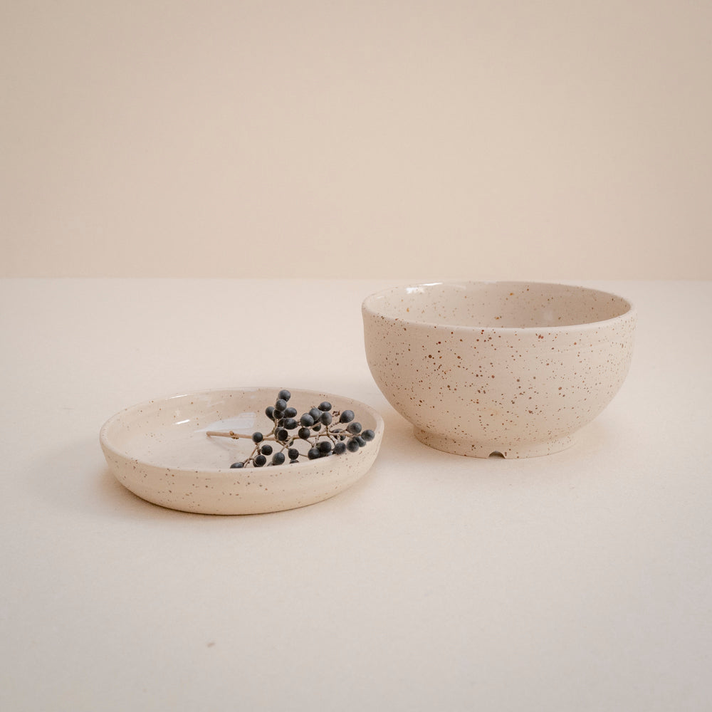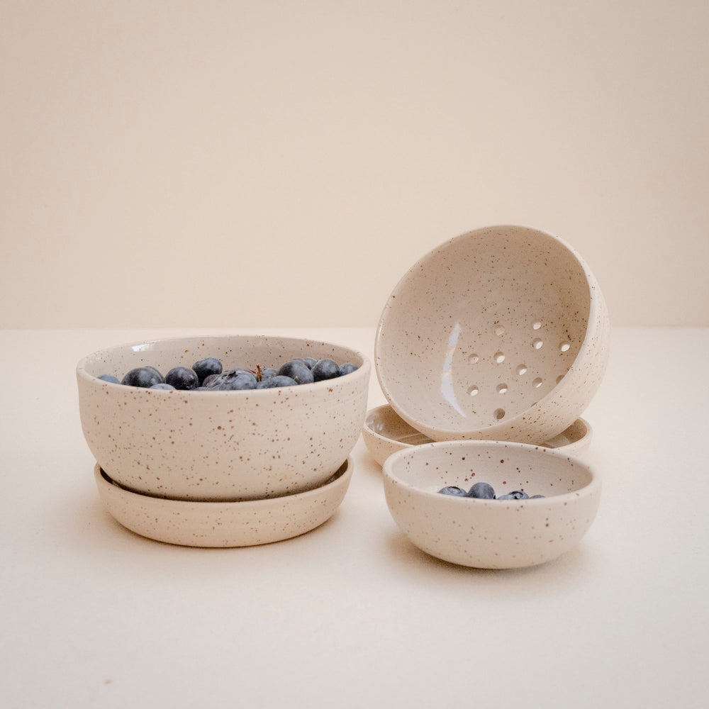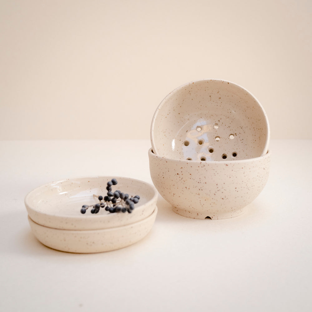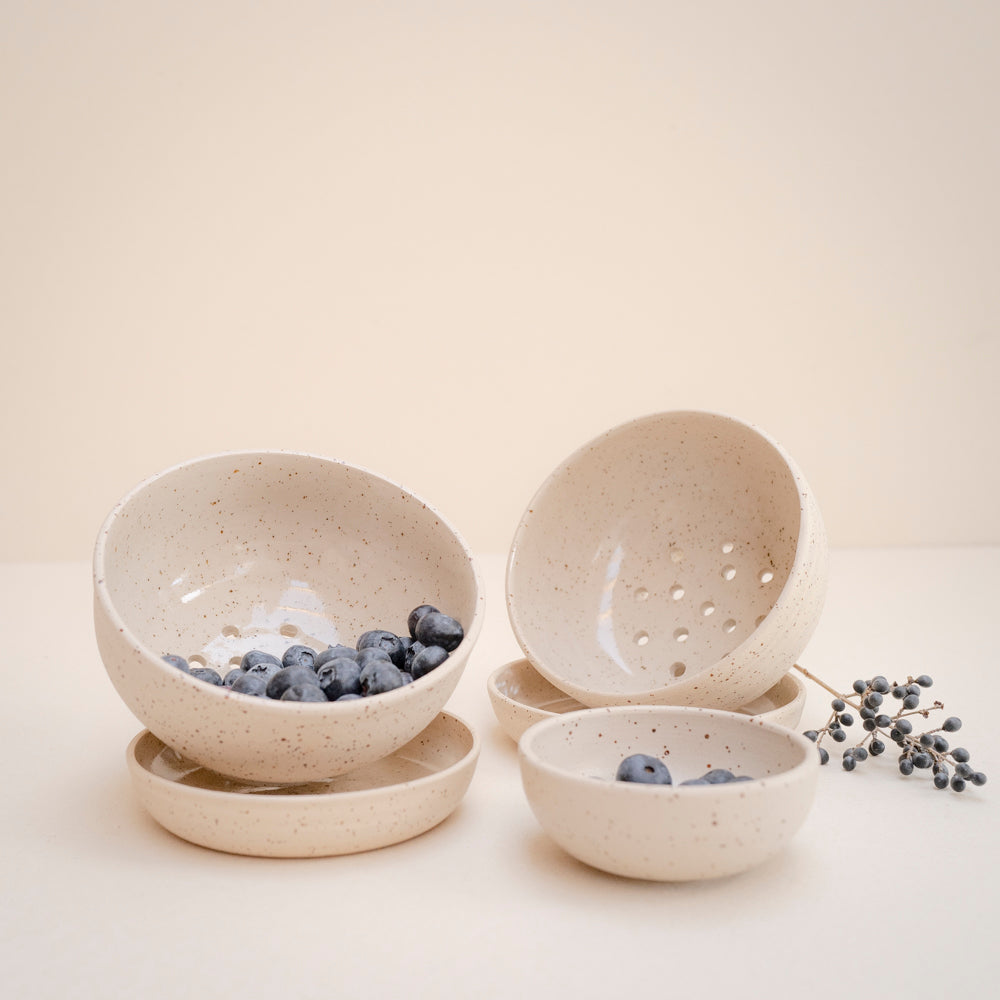 Colander made of white speckled clay. Perfect to have it on your sink and wash your blueberries or cherry tomatoes. Glaze with a transparent glaze and fired at 1220 ˚C.