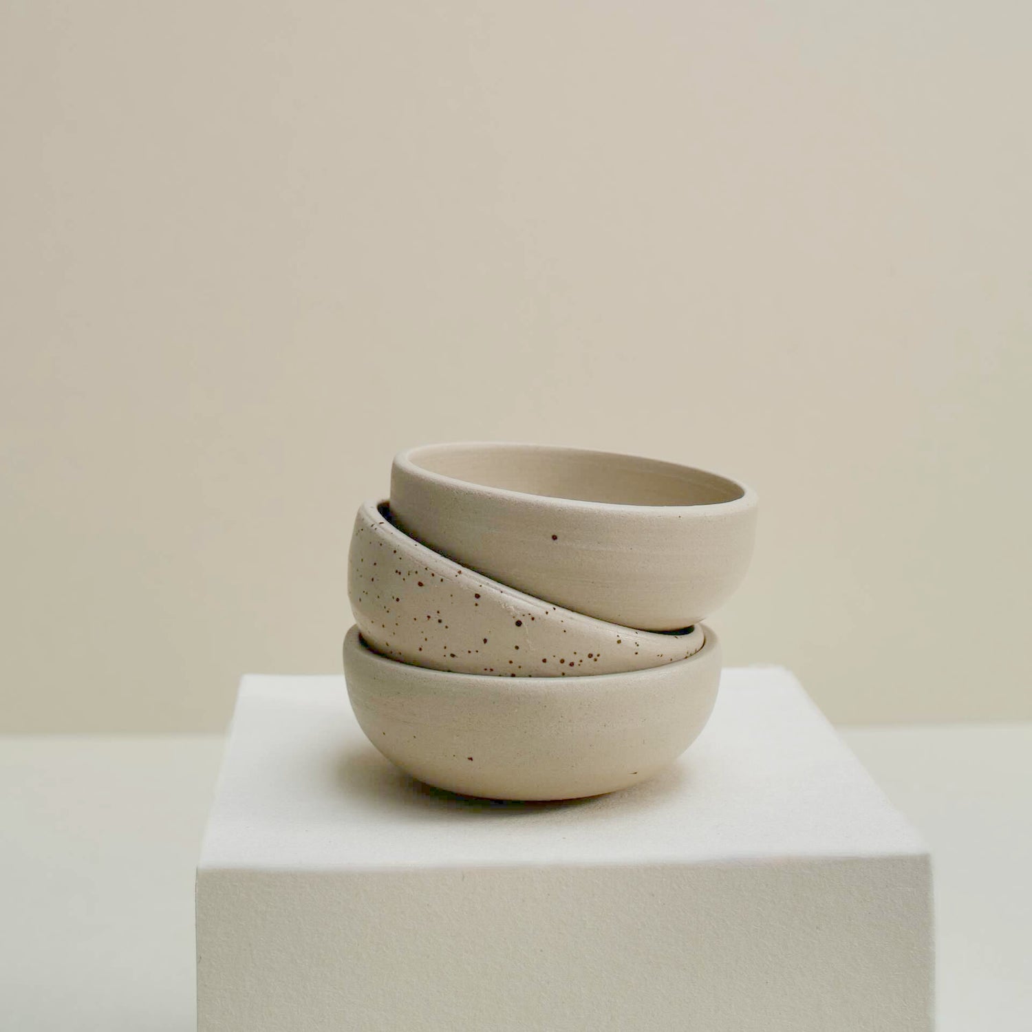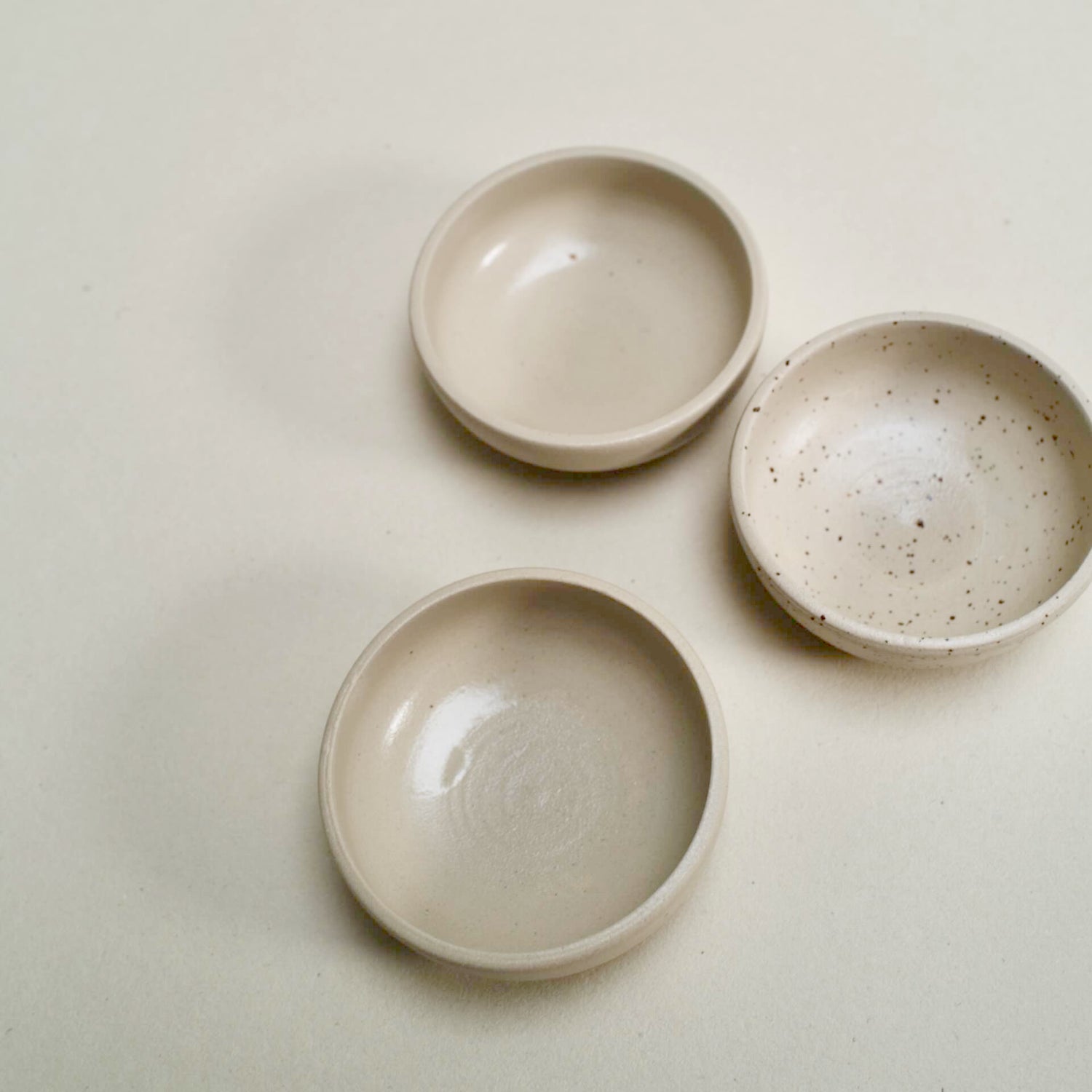 Small bowls made of white and speckled clay, perfect for serving some olives or tapenade or for your used tea-bag, glazed with a transparant glaze and fired at 1220˚C.