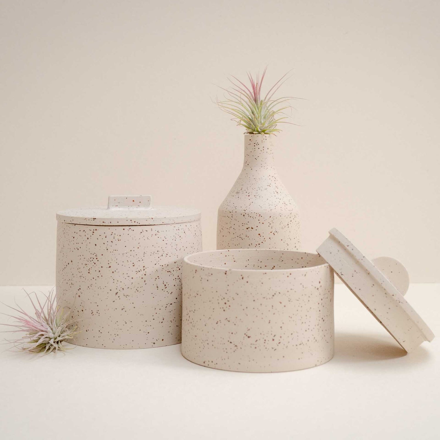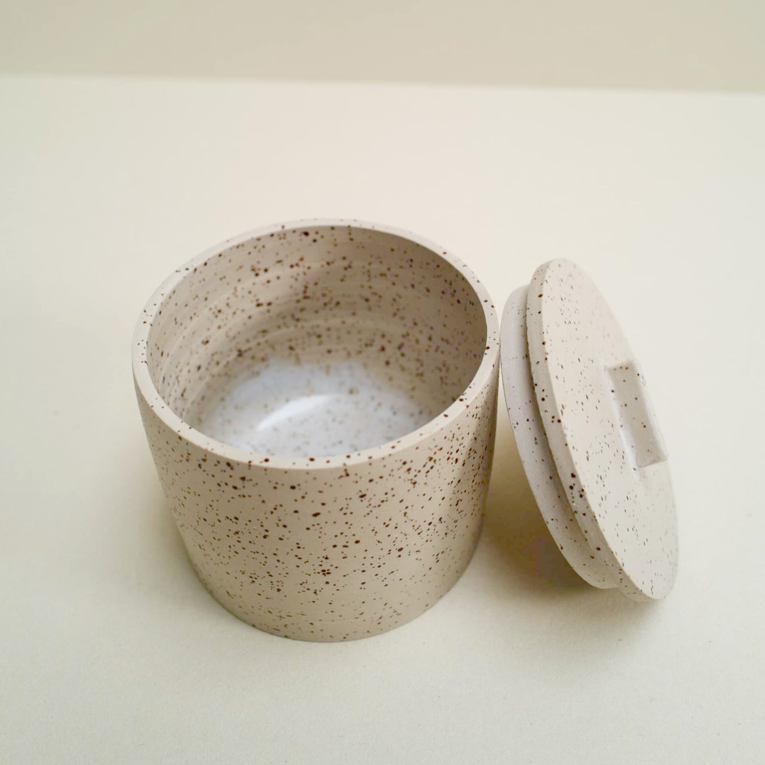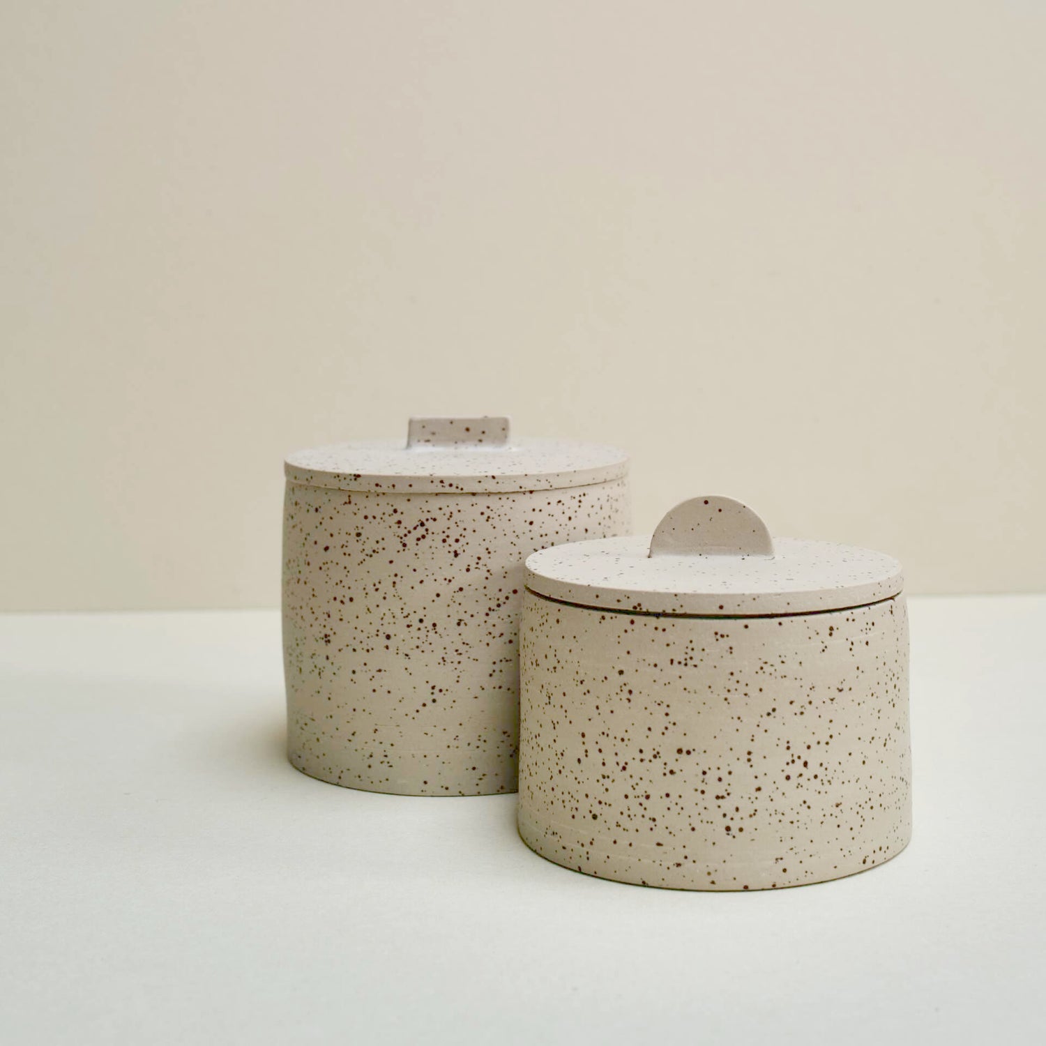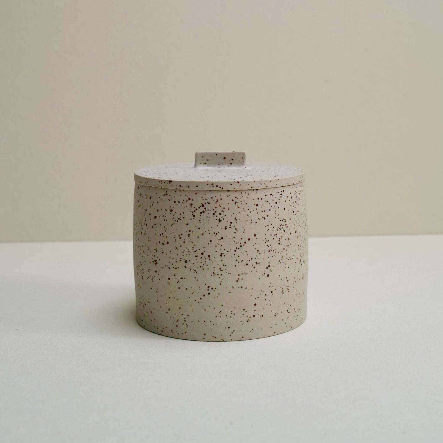 Storage jar in a speckled clay , perfect to store product which do not have to stay fresh, like coffee-cups, teabags, sugar, rice. Glaze with a Transparant glaze inside and fired at 1220˚C.